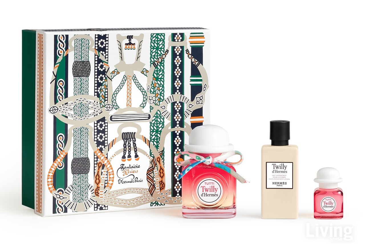 에르메스의 베스트셀러 트윌리 데르메스, 떼르 데르메스, 운 자르뎅 수르닐, 오 드 메르베이 등의 퍼퓸과 보디 제품을 함께 구성한 홀리데이 기프트 세트. 비르지니 자맹Virginie Jamin이 디자인한 까레 스카프 ‘판타지 데트리에Fantaisie d’étriers’에서 영감을 얻은 아름다운 패키지는 덤. 투티 트윌리 데르메스 2023 홀리데이 기프트 세트, 23만2000원.