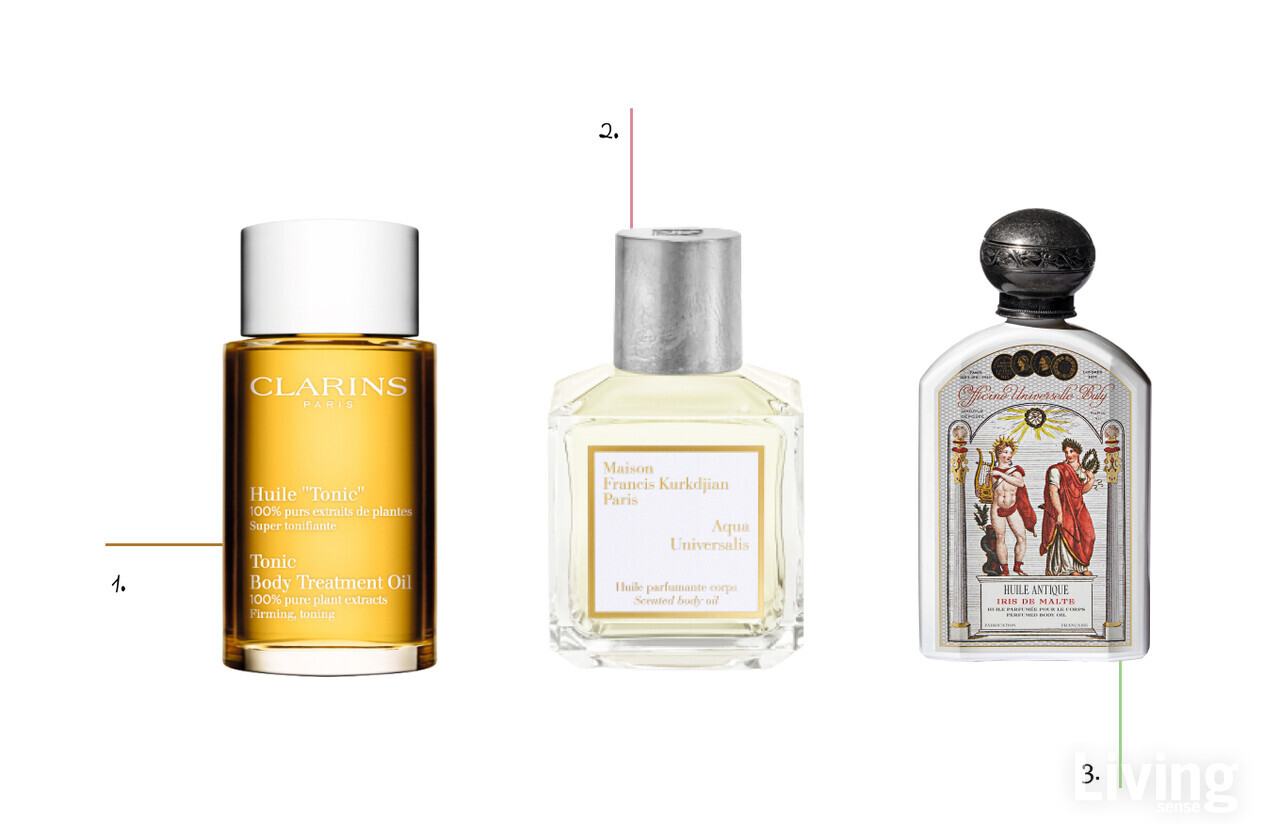 01. 로즈메리, 제라늄, 민트 등 순수 식물 추출물을 함유한 토닉 바디 트리트먼트 오일. 샤워 후 물기가 남은 상태에서 마사지하듯 발라 주면 건조함은 물론 튼살까지 예방해 준다. 100ml, 9만2000원 클라랑스.