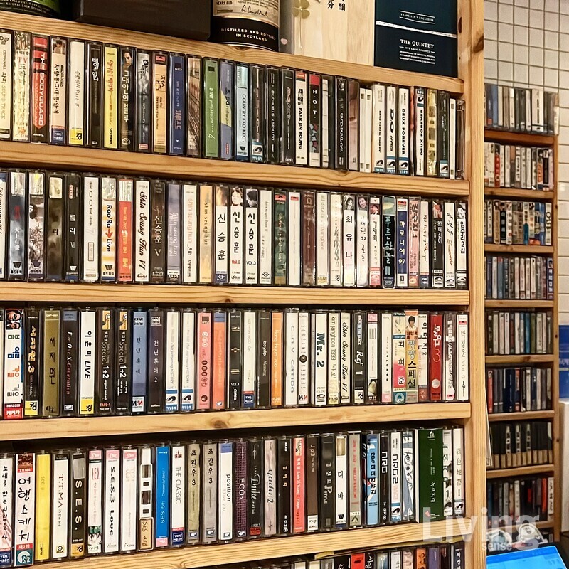 카세트테이프는 꽤 오래전부터 모아왔는데, 1000장이 넘는다. 새것과 중고가 뒤섞여 있다 벽에 액자처럼 비치된 LP판은 산울림처럼 내가 특별히 좋아하는 아티스트의 것들로 엄선해 전시했다.