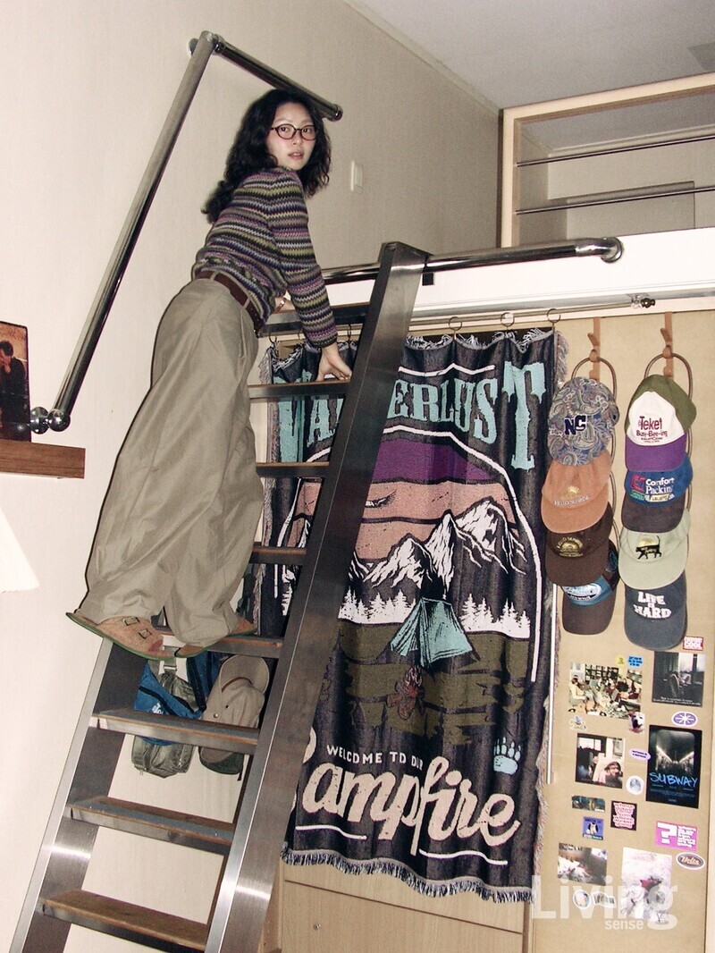 예산 내에서 공간이 분리되면서도 개방감이 느껴지는 집을 찾다 보니 자연스럽게 복층 구조를 선택했다. 복층에서 살아보고 싶은 로망도 있었고, 높은 층고가 주는 독특한 분위기가 매력적으로 다가왔다. 집의 가장 큰 특징은 계단 대신 철제 사다리가 있는 점. 이 요소를 활용해 빈티지한 감성을 강조하며 집을 꾸몄다. 공간의 톤을 정하는 게 가장 중요하다고 믿기 때문에, 좋아하는 딥 브라운과 그린 컬러를 베이스로 설정하고 이에 어울리는 아이템들을 찾아갔다. 첫 한 달 동안은 러그를 깔고 가구를 배치하며 기본적인 공간의 틀을 잡는 데 집중했고, 이후 시간을 들여 디테일한 요소를 추가했다. 장식장을 설치하고 조명으로 감성적인 분위기를 더했으며, 벽면에는 액자와 포스터 등을 걸어 점차 완성도를 높였다.