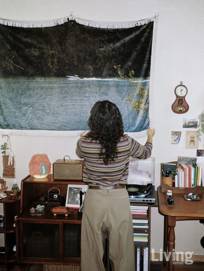 층고가 높은 공간은 비어 보이기 쉬운 만큼, 이를 보완하기 위해 슬립타이트오브젝트의 태슬 블랭킷을 벽에 걸었다. 자연 모티프의 숲과 호수 그림이 평온한 분위기를 더해주고, 부드러운 질감이 아늑한 느낌을 준다.
