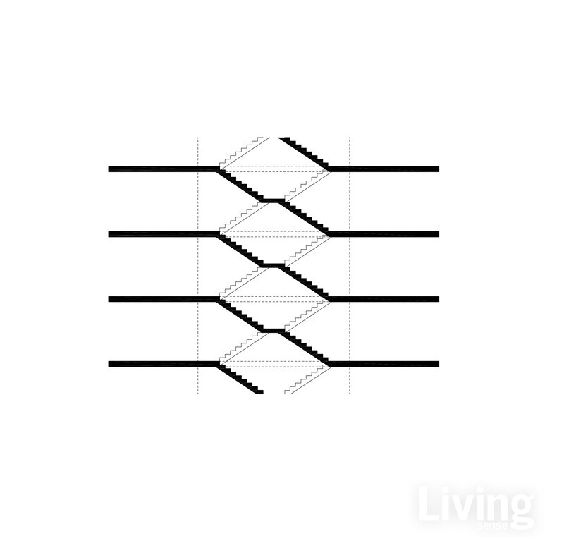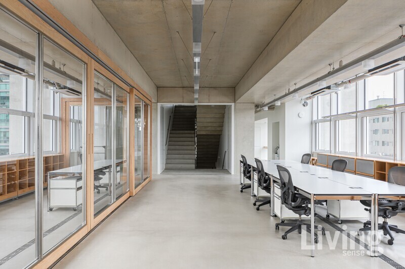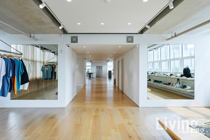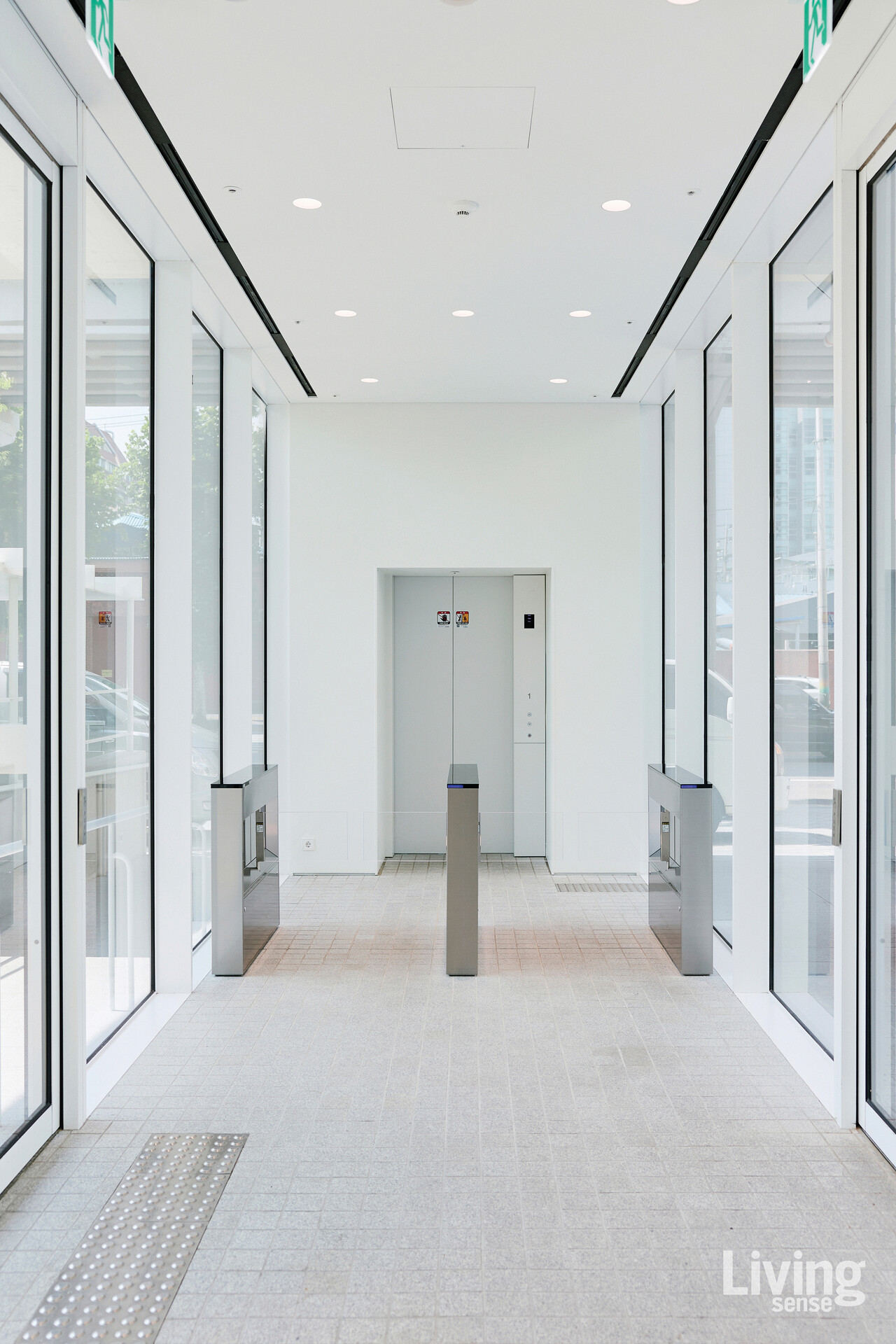 F&B 매장이 들어설 지하 2층부터 디스이즈네버댓·카키스 매장이 있는 지상 3층까지는 외부 손님이 오가는 구역으로 업무 공간과 분리해야 했다. 이를 위해 저층 전용 엘리베이터를 건물 중앙에 배치해 상업 시설과 업무 공간이 간섭 없이 운영되도록 설계했다. 오피스 공간이 시작되는 5층부터 10층까지는 2개의 곧은 계단을 교차한 가위계단이 이어지고 4층의 미팅 공간부터는 중앙 계단 코어가 엘리베이터 홀로 전환된다. 외부인과 직원의 동선이 겹치지 않도록 건물에는 총 4대의 엘리베이터를 설치했으며 중앙 계단은 고객 전용, 양 끝 엘리베이터는 10층까지 연결되는 직원 전용으로 구분했다. 보안 문제는 1층 엘리베이터 앞 스피드 게이트를 설치해 해결했다.