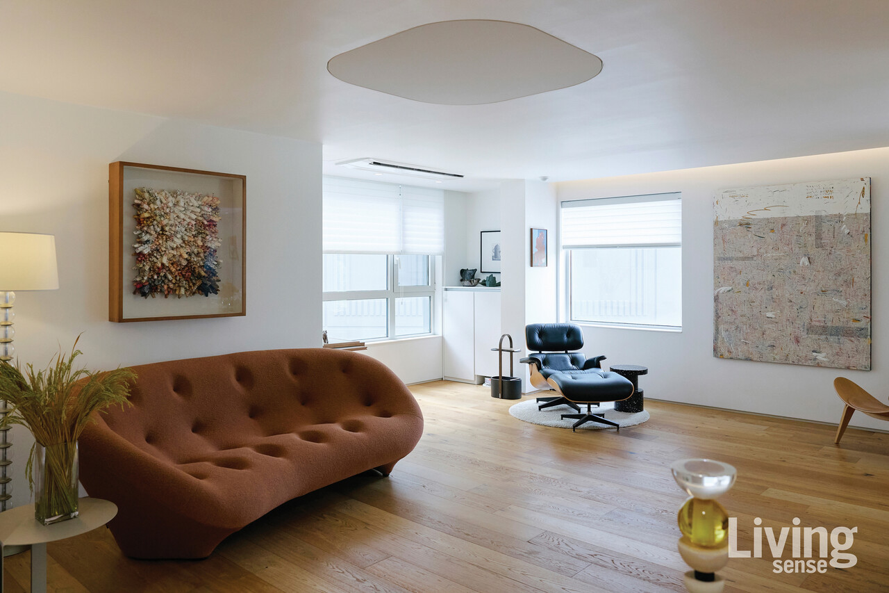 장준용 씨의 집은 그룹전을 연 작은 갤러리 같은 모습이다. 오래전부터 예술에 관심을 가진 장준용 씨. 미국에서 학창 시절을 보내며 델라웨어 강변의 흙으로 도자기를 만들고, 건축가 프랭크 로이드 라이트의 ‘낙수장 Fallingwater’을 견학하기도 하며 건축과 미술을 가까이했다. 동생이 분당 앤갤러리 N Gallery, @ngallery_art의 이사직을 맡게 되면서 예술은 장준용 씨의 일상 속으로 더 깊이 스며들었다. 새집을 꾸미면서도 예술 작품과 공간의 조화를 가장 중시한 그. 인테리어는 거실에서부터 출발했다. 기존에 사용하던 검은색 가죽 소파가 생각했던 공간의 이미지와 어울리지 않아 고민하던 차에, 나무 마루와 잘 어울리는 리네로제 Ligne Roset의 테라코타 컬러 쁠룸 PLOUM 소파를 발견해 망설임 없이 선택했다. 소파 위에는 전광영 작가의 ‘집합 Aggregation’을 걸었고, 맞은편 벽에는 TV 대신 뉴질랜드 화가 그레이스 라이트 Grace Wright의 노을을 표현한 대형 회화를 설치했다. “이전 집에서는 층고가 낮아 소파 위에 그림을 걸었을 때 답답한 느낌이 있었는데, 이곳에서 꼭 맞는 자리를 찾았죠.” 거실 한쪽에는 홍정우 작가의 페인팅으로 따뜻한 분위기를 완성했다. 침실에는 장 보고시안의 작품을, 집의 벽 곳곳에는 강경구, 이석주, 김영주 작가 등 그가 좋아하는 아티스트의 작품을 배치하며 전시장 같은 풍경을 연출했다. “예전에는 심플한 단색화를 좋아했어요. 소품도 블랙이나 화이트 같은 컬러를 좋아했고요. 결혼하고 아이들을 키우면서 점차 취향이 바뀌었는데요. 이젠 따뜻한 오렌지, 브라운, 우드 톤에 마음이 가네요.” 장준용 씨는 가구에도 깊은 애정을 쏟는다. 결혼 후 받은 첫 보너스로 마련한 칼한센앤선의 쉘 체어는 여전히 가장 아끼는 의자 중 하나다. 한 번에 모든 로망을 실현하기보다, 시간을 들여 차근차근 꿈꾸던 가구를 모아온 그. 최근에는 취향의 변화에 따라 나무 가구를 하나씩 들이고 있다. 이 집에 입주하면서는 비트라의 원형 테이블과 칼한센앤선의 위시본 Wishbone 체어를 주방에 두었는데, 가족이 식사 후 모여 대화를 나누고 음악을 들으며 하루를 마무리하는 장소가 되었다.