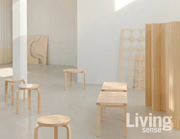 아르텍이 90주년을 맞아 핀란드 디자인 하우스 마리메꼬와 함께 특별한 협업을 선보였다. 마리메꼬의 프린트 아트와 아르텍의 정교한 우드 밴딩 기술이 만난 이번 프로젝트는, 건축과 자연, 그리고 인간 중심의 실용주의라는 공통된 철학을 지닌 두 핀란드 아이콘의 만남을 기념한다. 마이야 이솔라Maija Isola의 ‘아르키테흐티Arkkitehti’ 시리즈에서 비롯된 프린트는 핀란드산 자작나무 위에 은은한 마케트리 기법으로 새겨졌다. 나뭇결 위로 번지는 부드러운 광택과 절제된 패턴이 특징이다.
