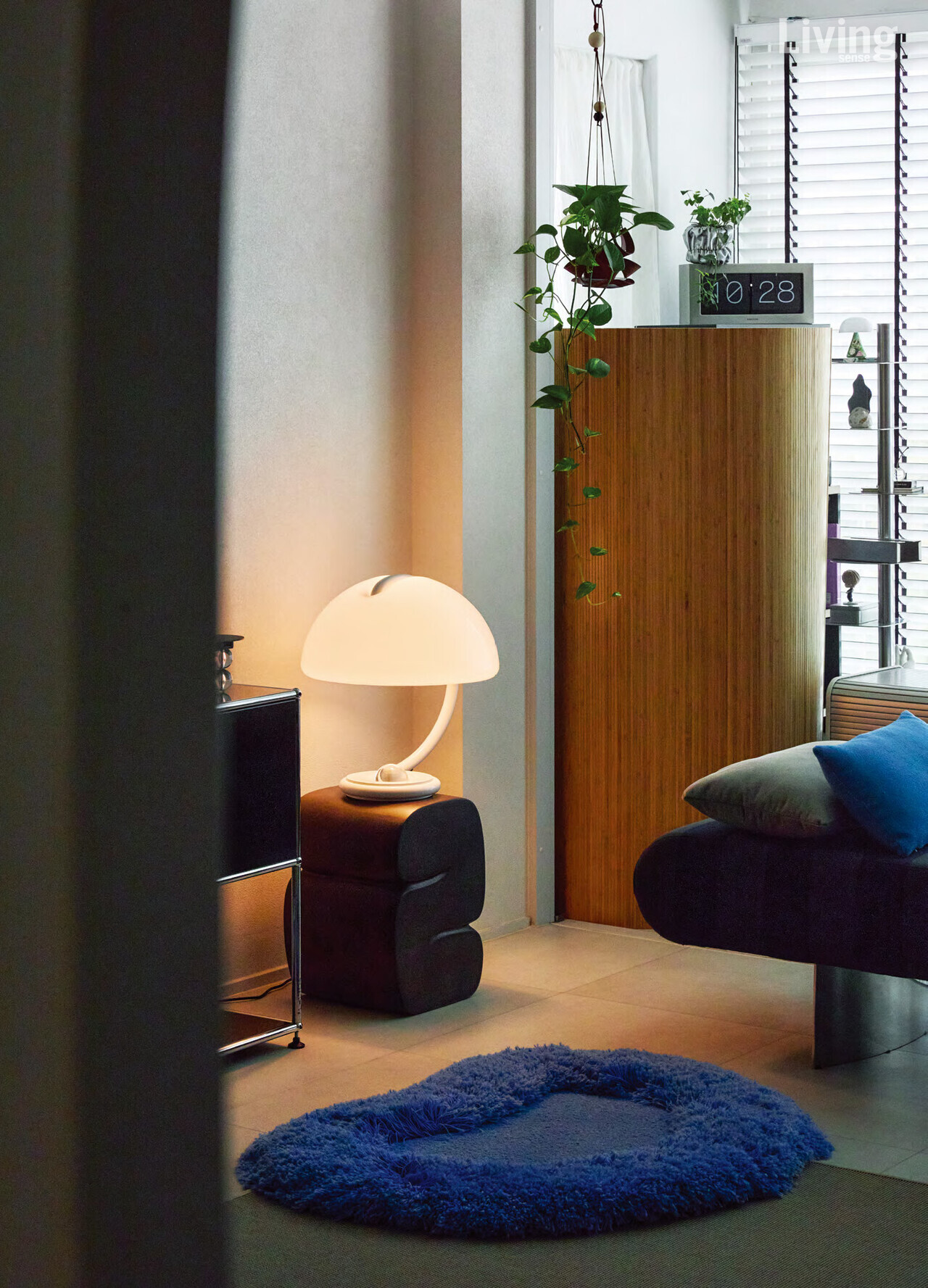 이전에는 우드 톤과 내추럴한 색감을 베이스로 해 오브제로만 포인트를 주는 편이었지만, 이 번에는 색을 더 과감하게 사용했다. 다양한 색을 집에 들이며 여러 시도 를 거친 끝에, 거실에 들인 블루 톤 소파와 데이베드가 공간의 중심이 되 었다. 그렇게 집의 시그니처 컬러도 자연스럽게 파랑으로 물들었다. “예 전엔 푸른색을 좋아하지 않았는데, 이제 저도 모르게 블루 컬러의 아이템 에 눈이 가요. 주방에 새로 건 그림도 그 색에 맞춰 선택했죠(웃음).”