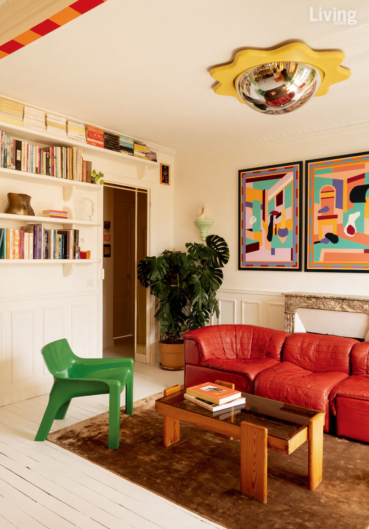 품 및 예술 작품들은 절충주의적인 조합을 이뤄냈다. 스위스의 가구 브랜드 드 세데De Sede의 새빨간 가죽 소파가 시각적 구심점이 되는 가운데, 그 아래에는 프랑스의 텍스타일 브랜드 시빌 드 타베르노Sibylle de Tavernost의 러그를 깔아 안락한 질감을 더한다. 이를 중심으로 아르떼미데Artemide를 위해 비코 마지스트레티Vico Magistretti가 디자인한 녹색의 비카리오Vicario 라운지체어, 노란색 아동용 의자의 비비드한 컬러가 팝아트적인 감각을 부각시킨다. 1960년대식 커피 테이블은 생투앙의 벼룩시장에서 찾았다. 벽면에는 캐롤라인 데르보 본인의 작품인 코쿤 사이클Cocoon Cycle을 걸어 두었다.