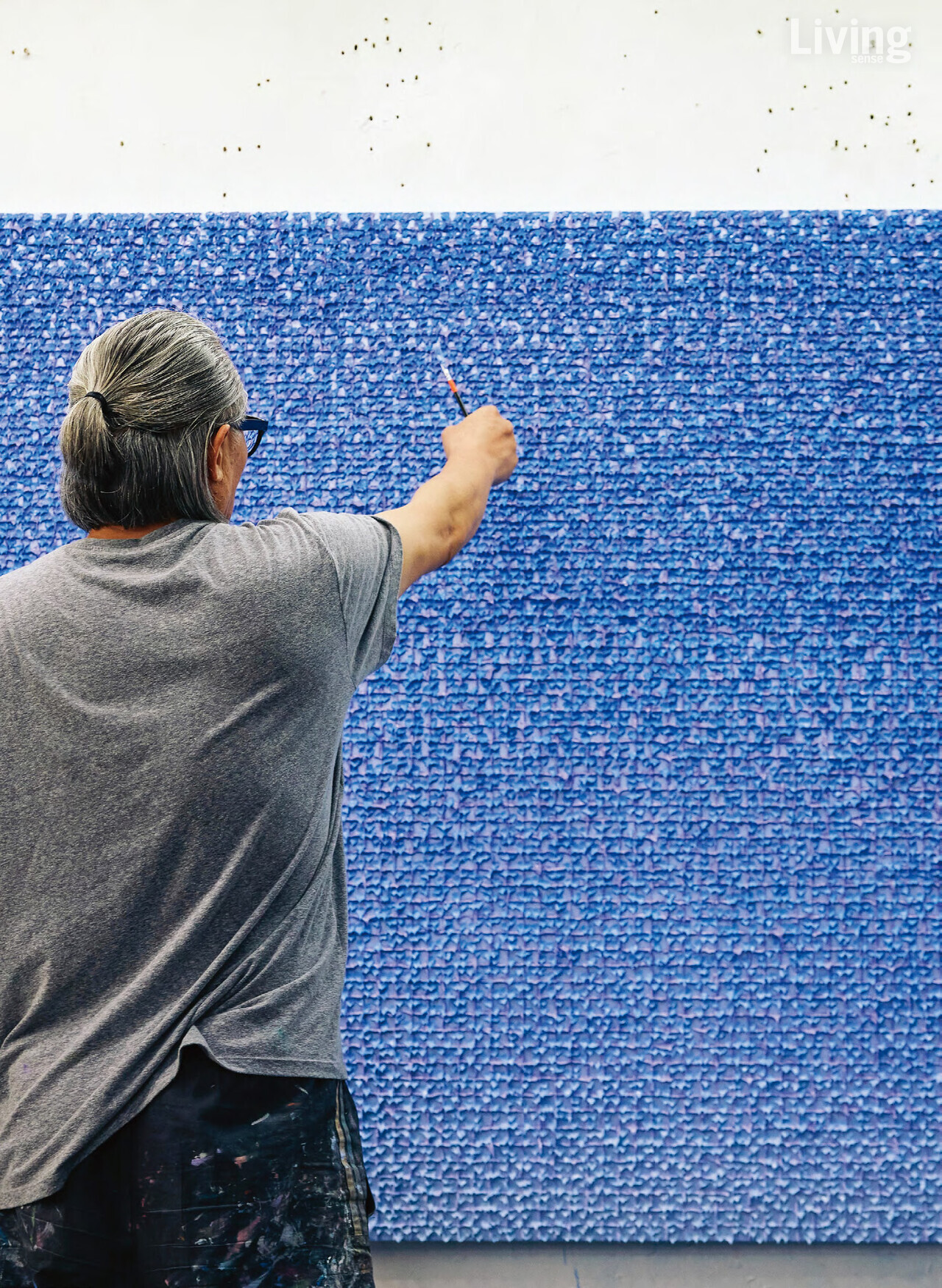 처음엔 자연의 색 그대로를 사용했다가, 요즘엔 파란색을 위주로 작업 중이다. 파란색이 주인공이지만, 작가는 여기에 다른 색을 아주 조금씩 섞어 색에 다른 표정을 준다. 그리고 그 색들은 캔버스 위에 모여 어떤 깊이와 서사를 만들어가는데, 작품을 마주하다 보면 그 긴 이야기 속으로 빨려 들어가는 기분이 든다.